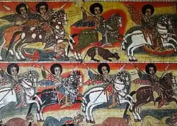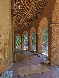 Ura Kidane Mehret is a church of the Ethiopian Orthodox Church, located on the Zege peninsula in Lake Tana of Ethiopia.[5] It is part of the complex of the Convent of Mercy. At least one author considers it the most attractive church in the Lake Tana region. It has been said that the inside of the Ura Kidane Mehret monastery is the most impressive and beautiful in the whole region. The monastery is highly decorated with beautifully painted, colourful and vibrant frescoes depicting Ethiopian saints and the history of the Ethiopian-Orthodox Church. Both men and women are permitted to enter and there is also a small museum, the Zeghie Satekela Museum, for visitors to learn about hand-crafted objects and musical instruments that are still used by the local communities today.