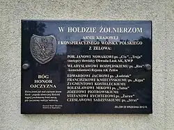 When the Germans invaded Poland at the start of World War II in September 1939, they began to rob and terrorize the Jewish population. Some Jews fled the town in 1939, but the Jewish population increased when the Germans resettled hundreds from nearby towns in Zelów. The ghetto population rose to more than 6,000 by early 1941. During this early stage of the war, local ethnic Germans were often brutal to the Jews, but some Poles and local Czechs were more sympathetic, even providing some food. Similarly, the German wholesale company Karl Lieb provided food vouchers to the local Jewish population. The Germans imprisoned several Polish women from Zelów in a female prison in Łódź for helping Jews and their fate remains unknown.[8] A subcamp of the Nazi German prison in Sieradz was operated in Zelów, and another subcamp was located in the present-day district of Herbertów.[9] Nevertheless, the Polish resistance movement was active in the town. In what must be a unique occurrence, two Jewish boys played on the Hitler Youth football team, a fact that brought an angry protest from one of their opponents. In spring 1942, ten Jews were publicly hanged with the Jewish population forced to watch. In June, some Jews were sent to the Chełmno extermination camp, where they were immediately gassed. About 100 were sent to the Łódź Ghetto. In August 1942, the remaining Jews were rounded up and held in a local factory and church. Some were murdered on the spot, about 150 were sent to the Łódź Ghetto, a few tried to hide, and the rest were sent to be murdered at Chełmno.[10] The German occupation ended in 1945, and the town was restored to Poland, although with a Soviet-installed communist regime, which remained in power until the Fall of Communism in the 1980s.