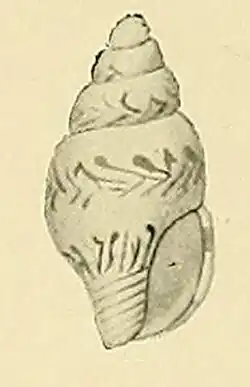 The spire is rather short, conical and a little higher than the aperture. The outlines are faintly convex. The protoconch is papillate. The spire contains 5 whorls, regularly increasingand flatly convex. The body whorls id ventricose and rounded. The base of the shell is somewhat contracted. The suture is not much impressed. The aperture is narrow, angled above, not much narrowed below, and without a distinct siphonal canal. The outer lip is straight above, convex below and smooth inside. The columella is subvertical, lightly turned to the left below. The inner lip is very narrow and thin, smooth and spreading over the straight parietal wall. The operculum is unknown. (Original description) [2]