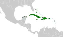 The Zenaida dove breeds throughout the Caribbean[7] and the tip of the Yucatán Peninsula, an example habitat being in the Petenes mangroves. It was reported by John James Audubon to breed in the Florida Keys, but there are only three verifiable records from Florida. It is found in a variety of open and semi-open habitats. Its mournful cooOOoo-coo-coo-coo call is similar to the call of a mourning dove, but faster in pace.[3]