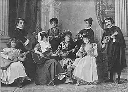 In England in 1888, they billed themselves as "The Zerega Spanish Troubadours", consisting of "two on mandolin and guitar, with tambourine, castanet and fairy-bell accompaniments", appearing at the Royal Albert Hall, West Theatre.[10] They also toured as "Zerega's Spanish Minstrels".[2] On 17 and 21 August 1895, "These famous Mandoline and Guitar Players, Singers, and Dancers had the honour of appearing before her Majesty the Queen [Victoria] [at] Osborne House",[11] and performed the following programme:[12]