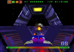 The third and last mode revolves around flying BamBam through a confined space at high-speed inside of an alien ship and destroy its reactors, while collecting power-ups by passing through a flashing panel. Sound plays a key role during this mode, as the player's shots can determine which walls are indestructible to avoid crashing against them.[4]