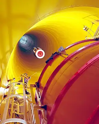 The service building at the top of the shaft contains a shop area, control room, and a clean room. Assembly, servicing, and balancing of the experiment vehicle are accomplished in the shop area. Tests are conducted from the control room, which contains controls for the "pump down" of the vacuum chamber, the experiment vehicle pre-drop checkout, release and the data retrieval system.[2]