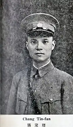 Zhang Dingfan, (Chinese: 张定璠; 1891 – 25 January 1945) alternate name Zhang Boxuan 张伯璇, was a Chinese military general, police officer, and politician who cut his teeth during the 1911 Revolution in Wuchang and successively rose to the rank of General throughout the various civil wars of the 1920s to the Japanese invasion of World War II.