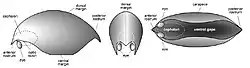 Zhenghecaris is an extinct genus of enigmatic arthropods from the Lower Cambrian Maotianshan Shales, tentatively classified as a hurdiid (peytoiid) radiodont,[1][2][3] and originally as a thylacocephalan.[4] The genus contains a single species, Zhenghecaris shankouensis, known from several specimens mostly preserving the carapace and eyes. These specimens measure roughly 15 cm (5.9 in) in width, making it one of the largest thylacocephalans, behind Ostenocaris, Dollocaris and Ainiktozoon, as well as the earliest since all other thylacocephalans are Ordovician or younger. Better preserved fossils show that it was more similar to the domed sclerites of radiodonts such as Cambroraster, with two lateral spine processes on either side of the carapace, the eyes apparently fitting into the posterior notches.[3] Additional isolated sclerites from the Chengjiang have been described as the lateral sclerites of Zhenghecaris due to their broad similarity to the P-elements of hurdiids (peytoiids), and because of their similar construction, ornamentation, and possession of two-pronged lateral spine processes.[1] It has also been classified conservatively as Arthropoda incertae sedis, as the fragmentary remains cannot confidently be classified further due to the lack of associated appendages of trunk elements.[5]