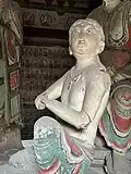 The hall contains eleven sculptures from the Northern Han period. These are the only Chinese sculptures from the period that survive from outside the Mogao Grottoes.[1] There is a main statue of Sakyamuni flanked by Bodhisattvas and the Heavenly Kings.[10]