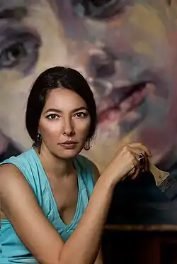 In 2021 Gershman was named an Ambassador to art materials company Royal Talens North America and art supply business BLICK Art Materials.[14] Gershman's "First Face of War: Intimate Portrait of Ukrainian Teacher" sold for $100,000 at the Heritage Auctions with 100% of proceeds from the sale benefiting Ukraine during the 2022 humanitarian crisis.[15] Gershman's painting depicts Ukrainian school teacher Olena Kurilo, who was wounded by shelling in Chuhuiv during the Russian invasion of Ukraine. The painting was modeled from a photograph of a wounded Kurilo which was taken by photojournalist Wolfgang Schwan, and inspired the creation of a movement by Zhenya, called Brushes Over Bullets.[16] In her project 'Brushes over Bullets', Gershman encourages other artists to paint in solidarity with Ukraine.[17] Gershman has said that she intentionally made her "First Face of War" small in size, so that observers are forced to take a closer and more intimate look into the eyes and faces of her subjects.[18]