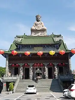 The temple is situated at the East and faces to the West. Lotus Lake is in front of the temple. On its right hand side lays Panping Mountain, and its left hand side is Great and Small Tortoise Mountains. The temple's style is a mixture of Eastern and Western. The structure is magnificent and the impressive style is dignified and solemn. The statue of the intelligent and courageous master garrisoned the village at then trance. It is height of 50 feet, length of 30 feet and width of 28 feet. It was inlaid by 387 units of Hunglung stones. The wooden carved traditional palace lanterns hung at the main temple has an impressive dignified and solemn air. The celestial dragons, lighting lamps, net walls, arches, relief in sculptures, tablets, and net windows are all carved in Chinese cypress with its true color remained. The door gods made of sunflower pear solemn. The sculptors of Tungyang of Chekiang Province especially came here to do the carving and inlaying work. The round columns and walls inside the temple adopt natural milky white fossils matched with wood sculptures. It set up both of elevators and staircases are facing each other; it's safe and convenient.