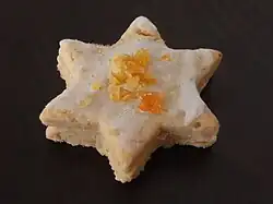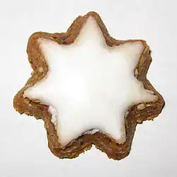 A Zimtstern (German pronunciation: [ˈt͜sɪmtˌʃtɛʁn] ⓘ, lit. 'cinnamon star'; pl.: Zimtsterne) is a Christmas cookie, originally from Swabia in Southwest Germany, made from foam of whipped egg white, sugar, at least 25% almonds, cinnamon and a maximum of 10% flour. It is most popular in Germany, Switzerland, and Alsace.[1]