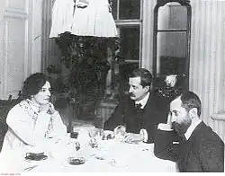 After the Meetings were closed in 1903, Gippius tried to revive her initial idea in the form of what was regarded as her 'domestic Church', based on the controversial Troyebratstvo (Brotherhood of Three), composed of herself, Merezhkovsky, and Dmitry Filosofov, their mutual close friend and, for a short while, her lover. This new development outraged many of their friends, like Nikolai Berdyaev who saw this bizarre parody on the Trinity, with its own set of quasi-religious rituals, as profanation bordering on blasphemy.[7][15]