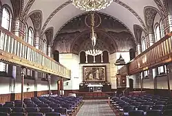The barrel vaulted church room has wooden galleries supported by iron pillars on both sides. The chancel is raised three steps and behind the altar table is a painting by P. Steffensen depicting Den Vantro Thomas (Doubting Thomas). The mural on the walls of the choir was painted by Johannes Kragh in 1899 and shows the Resurrection of Jesus. Krag also painted the mural on the west wall, surrounding the organ. It presents The Apocalypse.