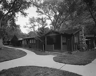 - Western Cabins Also known as "Deluxe Cabins, the duplex and quadruplex cabins built in a substantial manner with massive stone piers and fireplaces and open log truss ceilings. Infill walls are built in the studs out style. The Western Cabins were built beginning in 1927.[2]