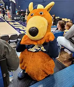 The school's nickname, "Zips", is a shortening of "Zippers", a pair of rubber overshoes and a brand name of the BF Goodrich Company of Akron. It was originally adopted by the school in 1925 after a contest to give the school a nickname. In 1950, the current nickname "Zippy" was adopted (perhaps because of the rising popularity of zippers in use on pants). Two years later, a committee suggested the kangaroo as a mascot ("Kangaroos" was one of the choices in 1925),[1] and it was accepted by the student council on May 1, 1953. In December of 1953, a "kangaroo contest" was held among a campus election to tie everything together. Joseph T. Dick, an undergraduate at the time, penned the original design, creating Zippy as she is officially known today.[2][3]