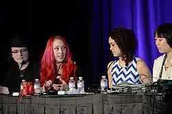 Quinn (second from the left) speaking at the Game Developers Conference in March 2016