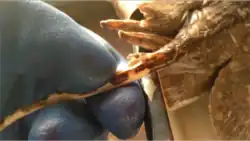 Close-up view of a Gymnura zonura tailbase, the small dorsal fin and black bands can be seen.[2]