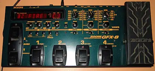 It has a solid steel dark green body with an opto-based pedal on the right and red LED display on the top left. It uses the Variable Architecture Modeling System (V.A.M.S) technology.[27] In general, there are three main internal modules: for drive, for modulation and for delay. The unit allows a high level of distortion customization by using specialized software. It also allows the use of external distortion. The technology used in the unit does not allow full reordering of the effects but allows some of modulation effects like wah and phaser to be connected before or after the drive module. The drive module implements dynamic related effects like compressor, overdrive, distortion and fuzz. After the drive module, the noise gate module called ZNR (ZOOM Noise Reduction) is connected, followed by a parametric equalizer (presence, treble, middle, bass). The amp simulation module is connected next and allows various types of guitar amplifier simulations. The modulation module implements effects like wah, phaser, chorus, ring modulator, tremolo, vibrato, flanger and pitch shifter. The delay module is used to implement delay and reverb effects. Effects that require high processing power use modulation and delay module together. One such effect is the jam play effect, which allows, for example, a guitar player to play a rhythm guitar part and then play a solo part over it. The unit design is oriented toward ease of use by providing more knobs than usually found on such units, thus making the unit look more like a chain of effect boxes instead of the typical effect processor with a "few knobs many functions" type design. The unit has mature MIDI capabilities, allowing both control from an external sequencer or using the unit as a MIDI controller. The MIDI OUT can be configured to act as MIDI THRU.