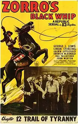 This serial was put into production, with Linda Stirling as the main star, following the actress' popular performance in The Tiger Woman.[4] Zorro's Black Whip was budgeted at $134,899 although the final negative cost was $145,251 (a $10,352, or 7.7%, overspend). It was the cheapest Republic serial of 1944.[1] It was filmed between 29 July and 26 August 1944 under the working title The Black Whip.[1] The serial's production number was 1495.[1] Despite physically wrestling with her, the villains never realize that the very obviously female Black Whip is a woman.[5] Footage from this serial was reused in Don Daredevil Rides Again and Man with the Steel Whip.[6]