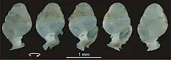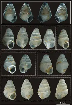 Zospeum tholussum was formally described by the German taxonomist Alexander M. Weigand in 2013, based on the specimens the caving expedition recovered. The specific name is derived from Latin tholus, meaning dome or cupola, referring to the distinctive dome-like shape of the second whorl of the shell. The nine type specimens are currently deposited in the Forschungsinstitut und Naturmuseum Senckenberg in Frankfurt am Main, Germany (museum voucher SMF 341633). The eight empty shells were used as the paratypes by Weigand, one of which was broken open to investigate the central column of the shell, while the single living specimen was designated as the holotype.[5] Zospeum tholussum is classified under the genus Zospeum of the subfamily Carychiinae in the hollow-shelled snail family, Ellobiidae.[13] Although some authors (including Weigand) consider Carychiinae to be a separate family, Carychiidae.[14]