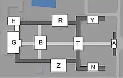 • Other buildings in the complex that are connected by the corridor are the large kitchen-residence (大庫裏, daikuri) (R), the meditation hall (禅堂, zen-dō) (Z), the large tea house (大茶堂, dai-chadō) (H).