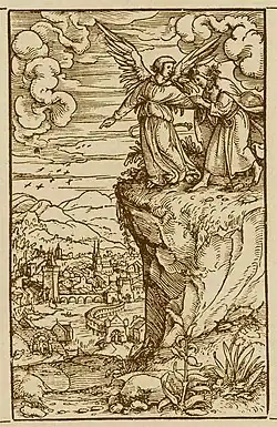 Froschauer commissioned a woodcut cycle on the Revelation of John from Holbein especially for the 1531 Bible. But this was not completed in time. Froschauer therefore had to resort to illustrations by the Basel printer Thomas Wolff to illustrate Revelation. Holbein had already produced the drawings used for a New Testament printed by Wolff in 1523. The woodcut cycle from the Cranach workshop in Luther's September Testament served him as a model; a special feature is the depiction of the New Jerusalem, in which one recognizes the city of Lucerne: the Museggmauer, the collegiate church and the Kapellbrücke with the Water Tower.[85]