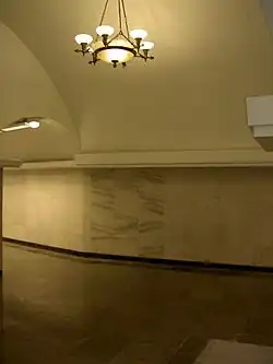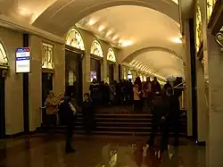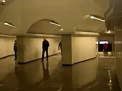 The tunneling was carried out simultaneously from this hall to both stations.[9] From the hall leading to Pushkinskaya, there are two corridors that end with ladders. These ladders replaced a pylon and two passages adjacent to it.