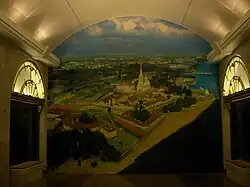 The station features mosaic panels made of smalt depicting the first soldiers of the Semyonovsky regiment who served during the reign of Peter the Great. These panels were crafted by the Russian Academy of Arts,[7] with the artist Alexander Bystrov as the creator.[8]