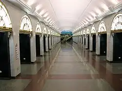 The original project of the station was executed by Russian architect Alexander Konstantinov.[5] However, after its opening, it was declared that the authors of the project were a group of architects from the Open Society "Lenmetrogiprotrans," led by N. V. Romashkin-Timanov. The team included N. V. Romashkin-Timanov, Yu. V. Eechko, D. A. Bojtsov, and N. A. Vinogradova.[6]