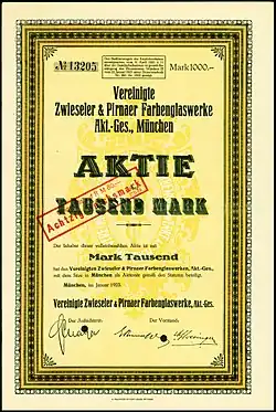 Share of the Vereinigte Zwieseler und Pirnaer Farbenglaswerke AG, issued January 1923