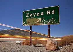 - ^ Rhymes or Porcupines 1476257698 Zzyzx Rd Sign, 1997. Two syllables make up this most unusual word. One of the strangest ... you've ever heard. The first part is Zi, the second is Zicks Together they form the name ... Zzyzx! Zzyzx Road leads to Tork's ... "