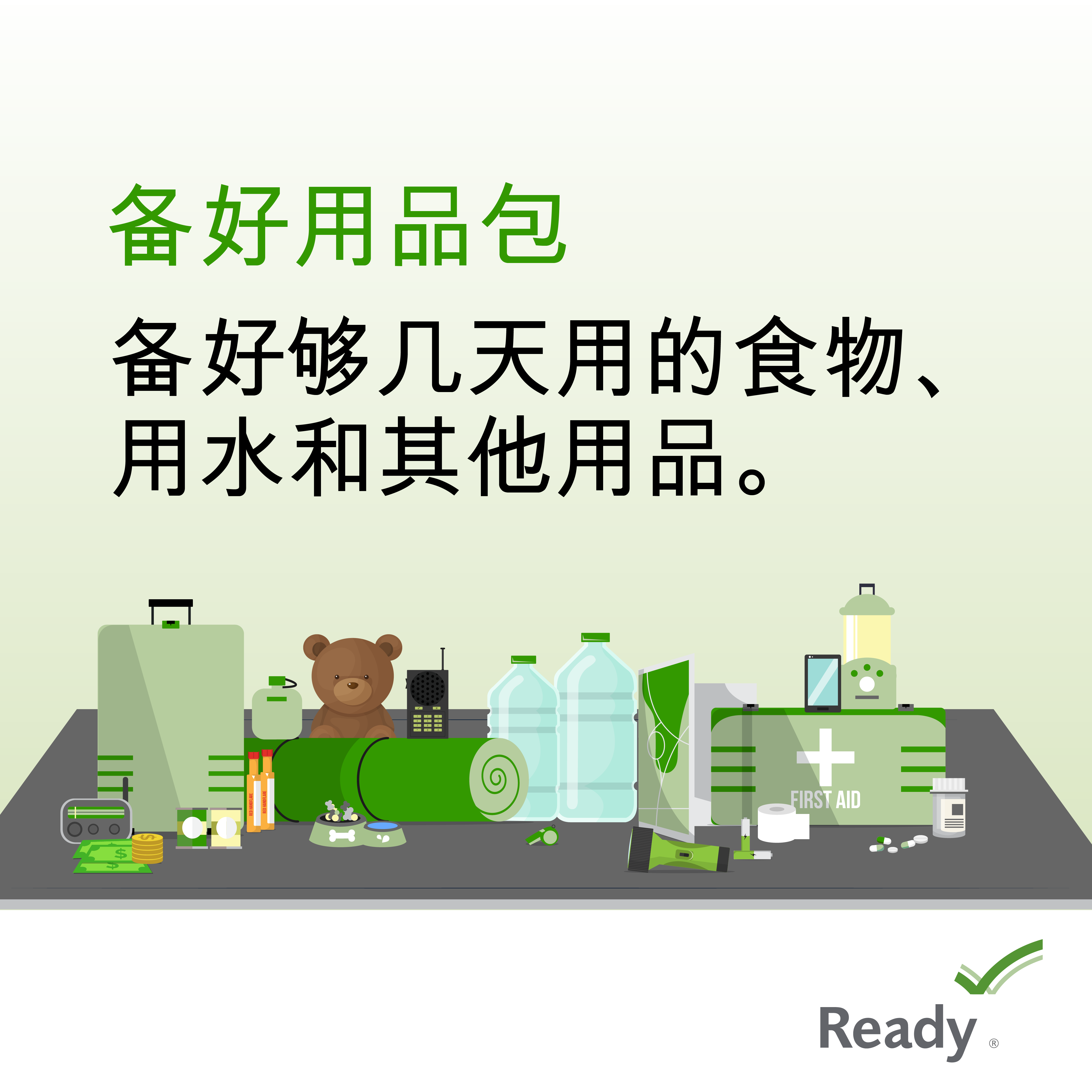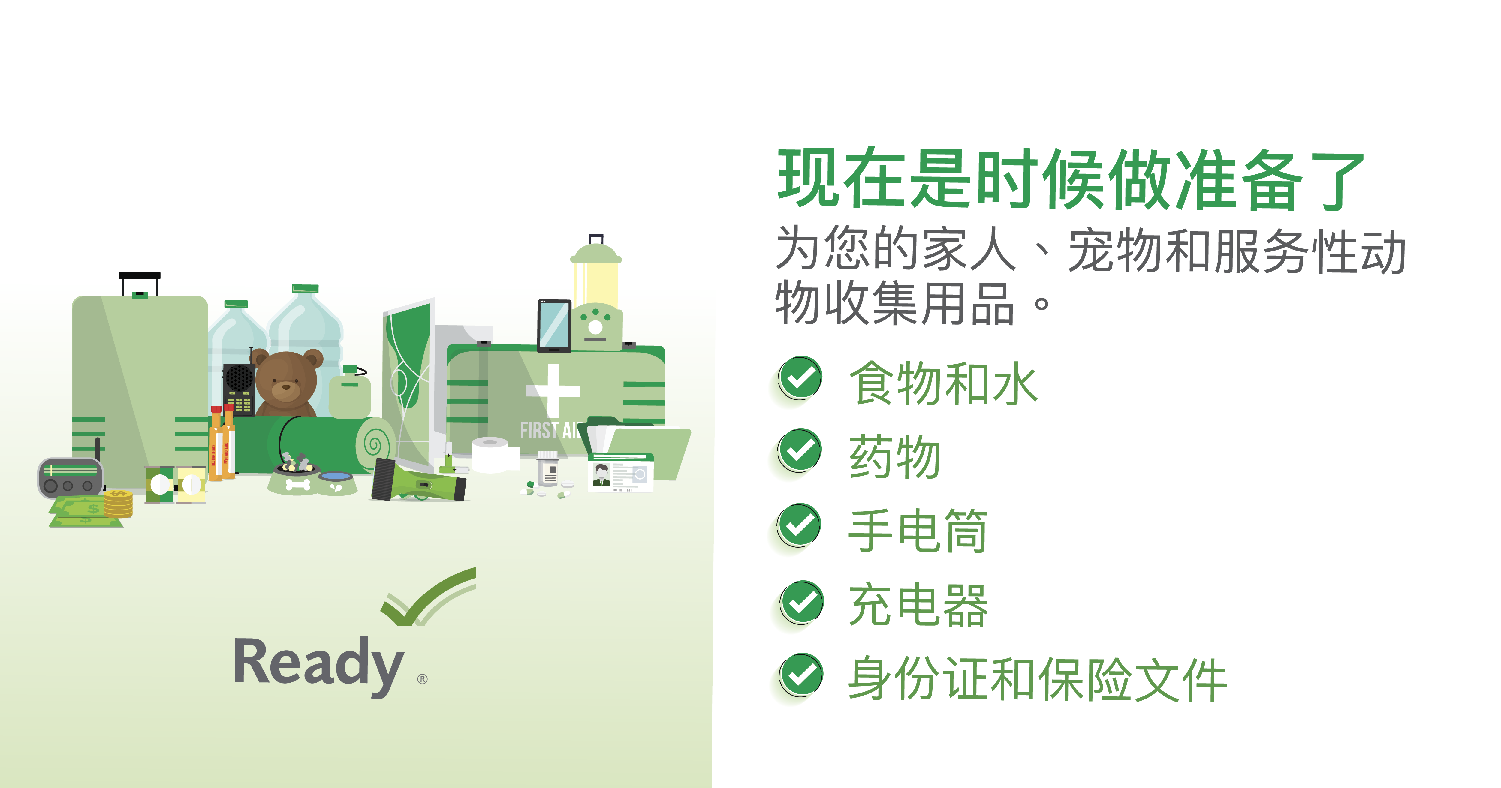 现在是准备的时候了。为您的家人、宠物和服务性动物准备物资。 物资包括食物和水、药物、手电筒、充电器、身份证和保险文件。